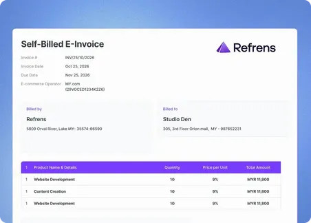 When suppliers are unable to issue e-invoices, Refrens helps you generate self-billed e-invoices effortlessly. Create compliant documents directly from your accounting data and submit them seamlessly to MyInvois—ensuring accurate reporting and zero manual work.